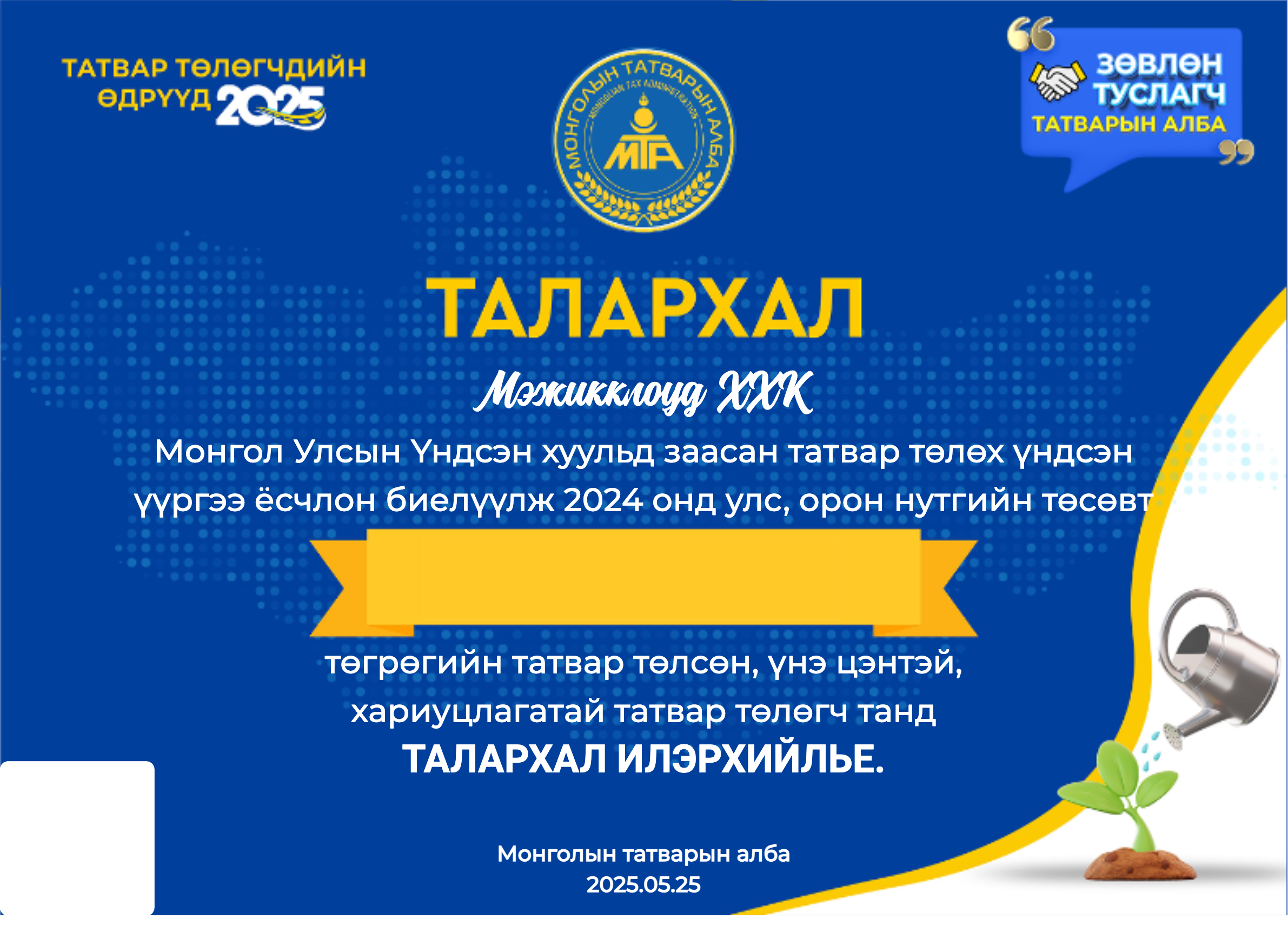 Өнгөрсөн жилүүдэд эдийн засгийн нөхцөл байдал сайнгүй байж, эдийн засгийн хямралд үргэлжилсэн боловч бид 2015-2016 онуудад 200 орчим сая төгрөгийн, 2017 оны эхний 8 сарын байдлаар 141,3 сая төгрөгнийн татвар, нийгмийн даатгалын шимтгэлийг хуулийн дагуу үнэн зөв тайлагнаж, төлж ирсэн байна.